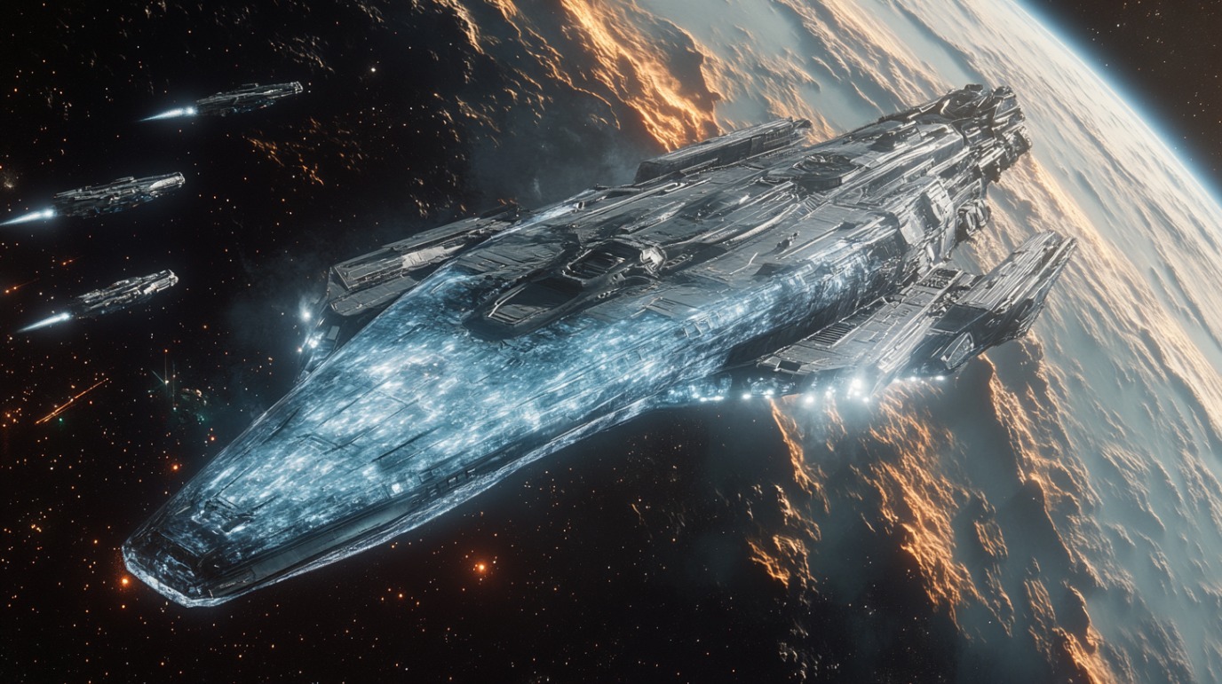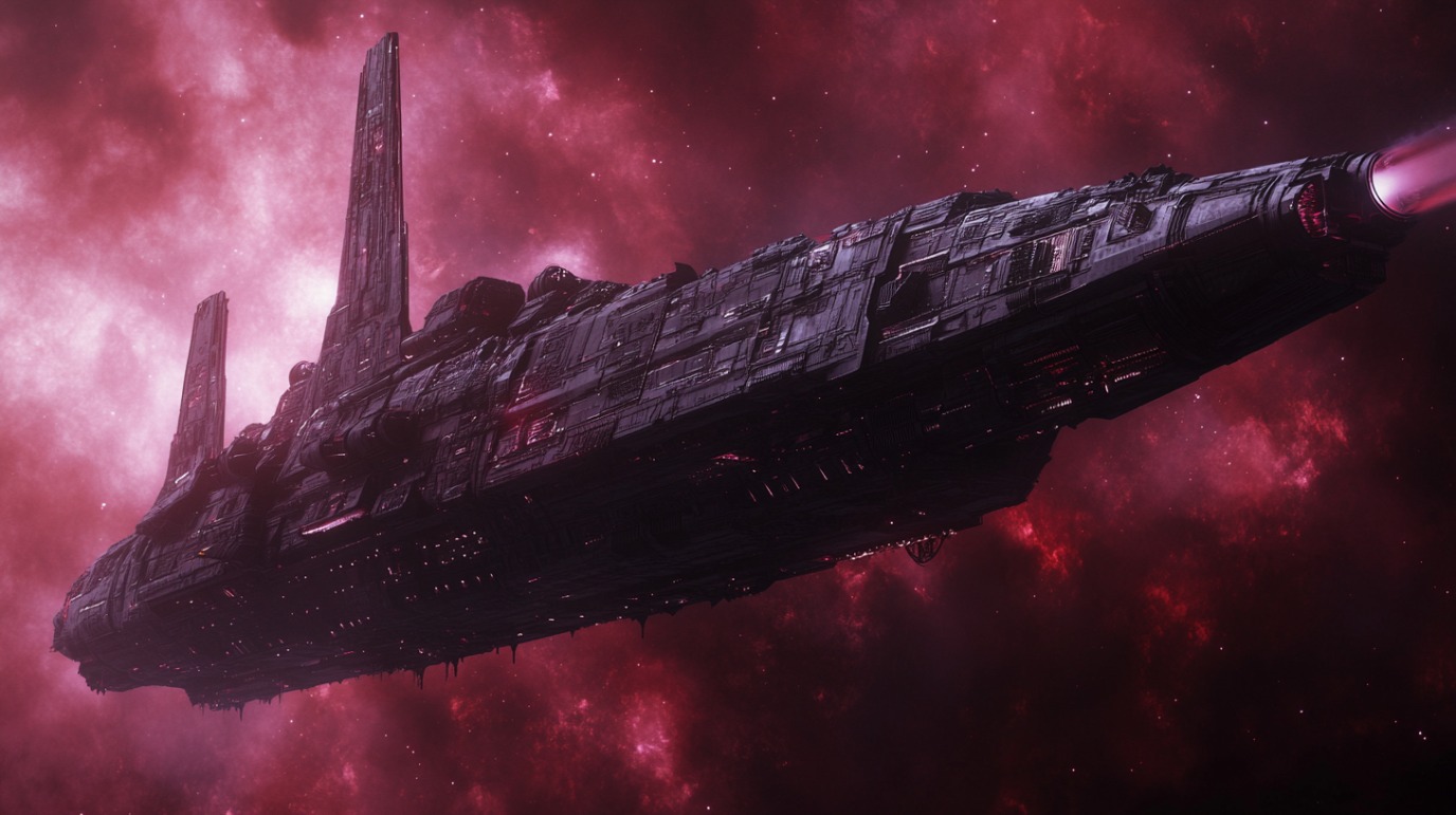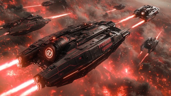Thaedian ships are the embodiment of their warlike culture, designed to inspire fear as much as to wage battle. Their exteriors are forged from dark alloys streaked with crimson energy veins, giving the impression of giant armored beasts pulsing with fire from within. Instead of the smooth and aerodynamic lines seen in Etulian craft, Thaedian vessels favor jagged silhouettes, blade-like prows, and spires that rise like skeletal remains, evoking the architecture of a cathedral turned into a fortress. From their smallest dropships to their massive flagships, every vessel radiates an aura of intimidation and raw power.