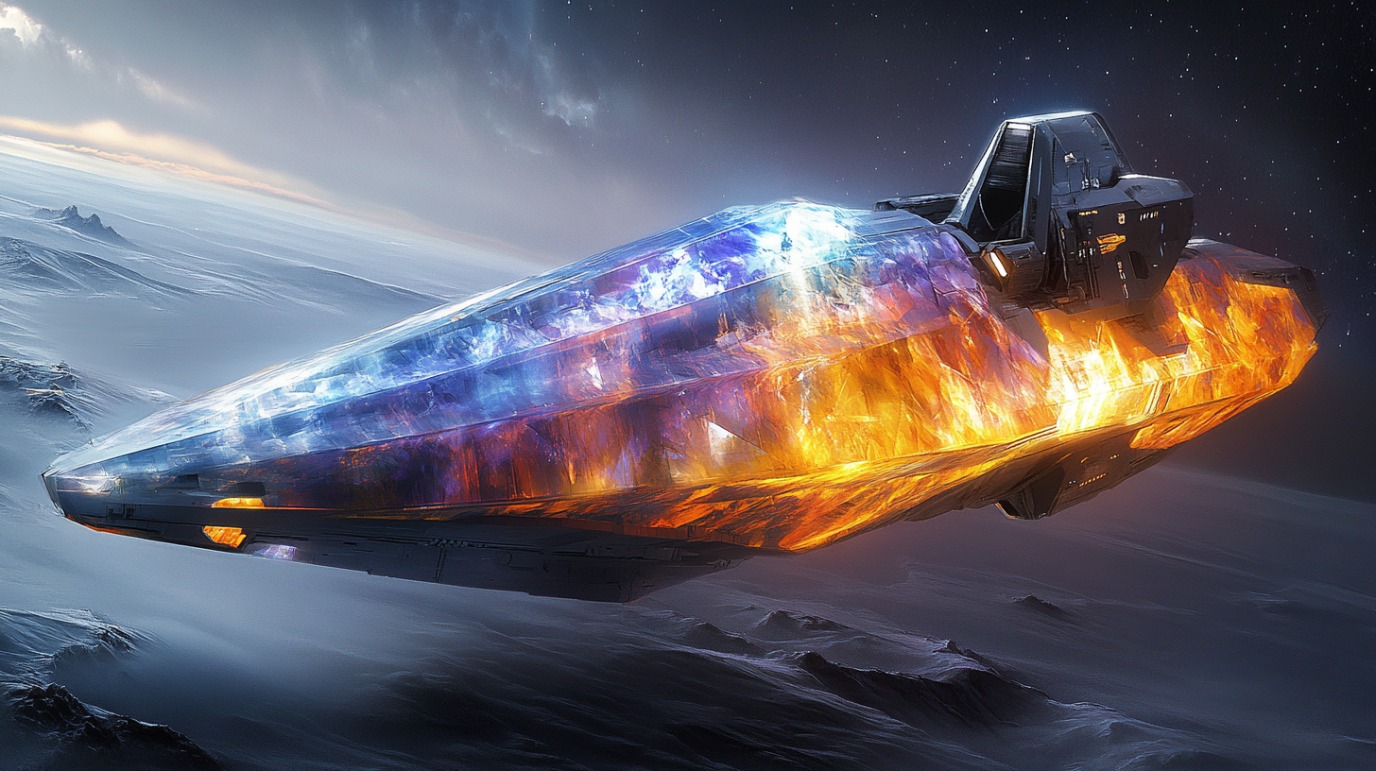 The PL-818 is one of the most advanced and emblematic ships of the Etulian fleet, conceived as a fighter-class vessel built entirely from metaquartz, a unique crystalline alloy that gives it extraordinary resilience. This material not only renders the hull virtually indestructible but also grants it stealth properties, making the PL-818 invisible outside of atmospheres or docking bays. Its design balances compactness and aerodynamics, resembling a predatory shard of black crystal brought to life, with smooth, seamless lines that appear grown rather than manufactured.